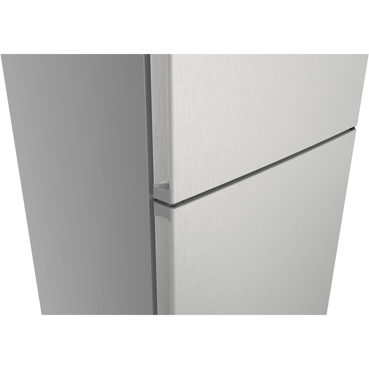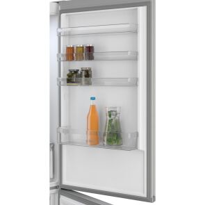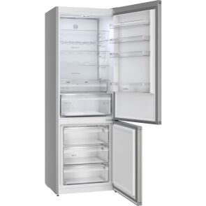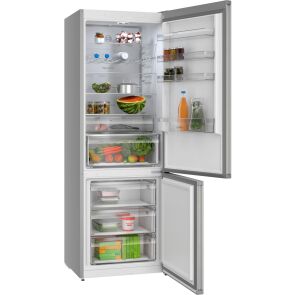 Zaletą tego produktu jest bardzo cicha praca. Dźwięk, który wydaje, jest podobny do szumu w domu, dzięki czemu urządzenie nie będzie Ci przeszkadzać w codziennej pracy. W chłodziarce producent zastosował system No Frost, który zapewnia prawidłową cyrkulację powietrza i utrzymuje niską wilgoć. Ta technologia sprawia, że na ściankach chłodziarki nie osadza się szron ani lód, co całkowicie eliminuje konieczność ręcznego rozmrażania. W urządzeniu zastosowano sterowanie elektroniczne. Taki panel sterowania jest komfortowy w obsłudze i pozwala na szczegółowe ustawienie temperatury w części chłodzącej lub w komorze mrożenia. Producent wyposażył lodówkę w oświetlenie LED, które cechuje się wysoką energooszczędnością i bardzo długą żywotnością. To przekłada się na mniejsze koszty eksploatacyjne lodówki. Diody LED świetnie oświetlają żywność we wnętrzu, dzięki czemu będziesz mógł sięgnąć po jedzenie, bez konieczności włączania górnego oświetlenia w kuchni.