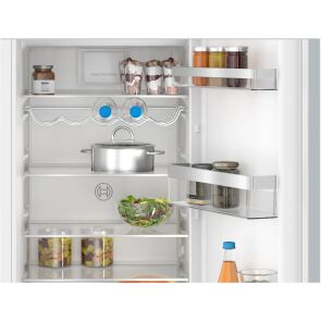 Lodówka Bosch Serie 4 KIL82VFE0 to idealne rozwiązanie do zabudowy, oferujące 280 litrów pojemności netto. Wyposażona w 5 półek z regulacją, balkoniki na drzwiach oraz półkę na butelki. Klasa energetyczna E i cichy poziom hałasu 35 dB zapewniają oszczędność energii i komfort użytkowania.