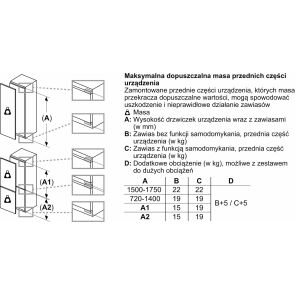Lodówka polecana jest do montażu w meblach kuchennych. Dzięki temu, że jest całkiem ukryta za frontem meblowym, idealnie wkomponuje się w każde pomieszczenie kuchenne. Lodówka jest średniej wielkości, dlatego zaspokoi potrzeby singla, dwóch osób lub rodziny z dzieckiem. Klasa energetyczna w uśrednionym zakresie według najnowszych norm Unii Europejskiej pozwala zużywać mniej energii niż przy lodówkach takiej samej jakości, ale w niższych klasach.