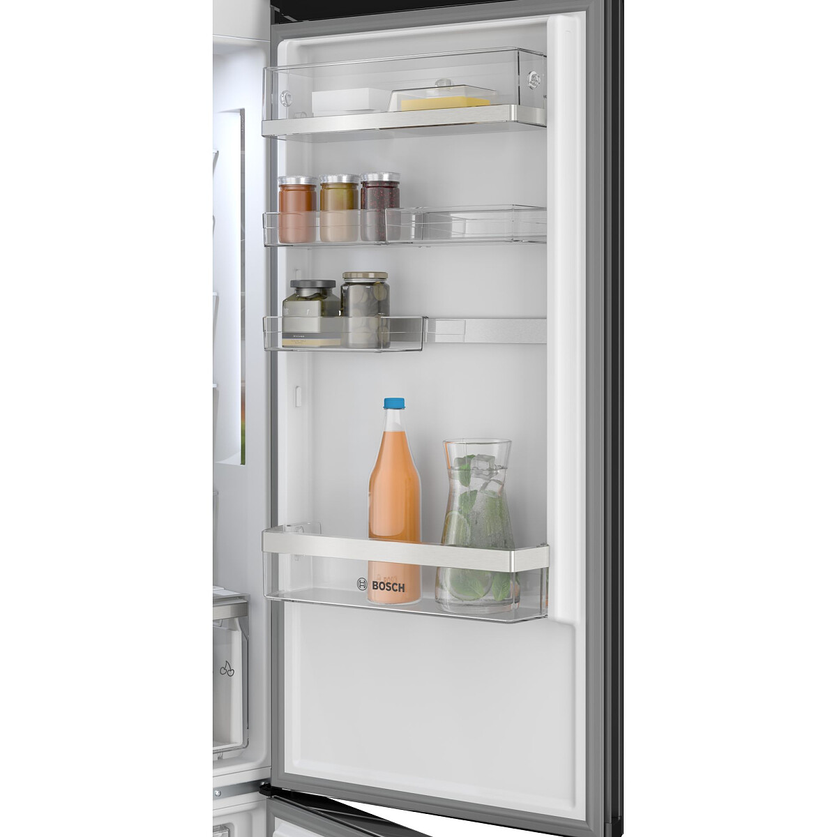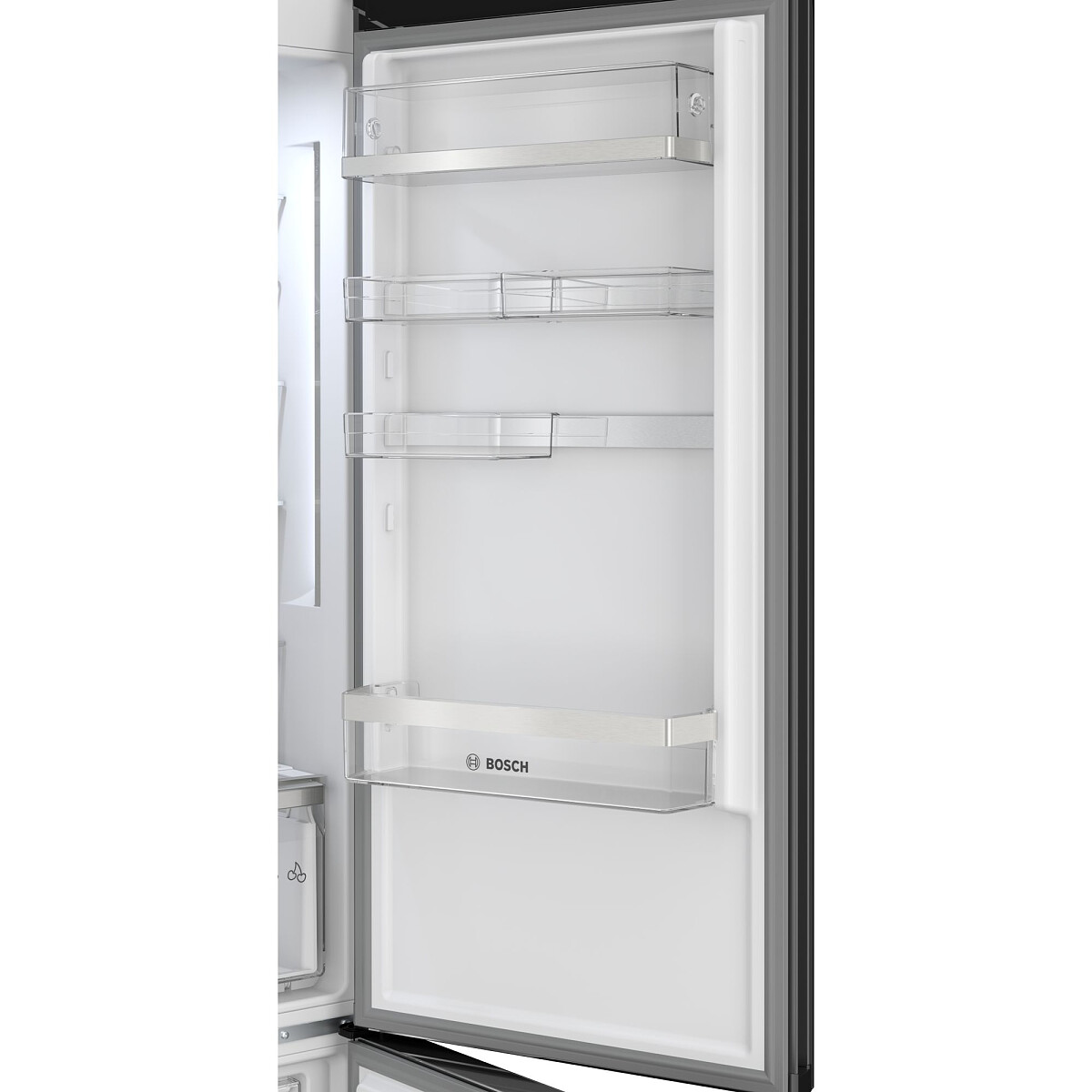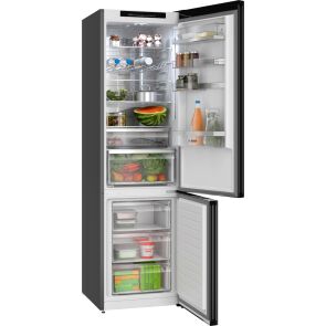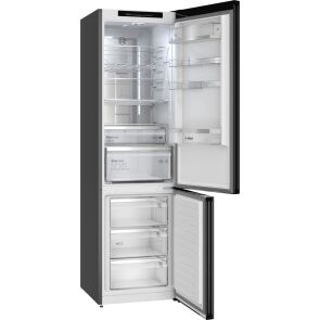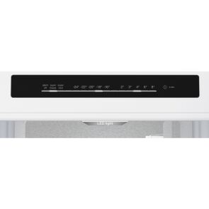 W lodówce zastosowano sterowanie elektroniczne. Taki panel sterowania jest komfortowy w obsłudze i pozwala na dokładne ustawienie temperatury w części chłodzącej lub w zamrażalniku. Producent wyposażył lodówkę w oświetlenie LED, które cechuje się dużą energooszczędnością i długą żywotnością. To gwarantuje niższe koszty eksploatacyjne urządzenia. Diody LED doskonale oświetlają półki we wnętrzu, dzięki czemu będziesz mógł sięgnąć po jedzenie, bez włączania głównego oświetlenia w pomieszczeniu. Półka na butelki ma specjalny kształt, dlatego jest najlepszym miejscem na chłodzące się butelki. Dzięki temu, że lodówka umożliwia obustronny montaż drzwi, możesz dopasować ją do swoich wymagań i wnętrza kuchni. Przełożenie drzwi w lodówce jest możliwe dzięki uniwersalnym zawiasom. Ten model został wzbogacony w praktyczną technologię szybkiego zamrażania, która czasowo obniża temperaturę w zamrażalniku, aby szybko zamrozić świeżo włożone produkty. Dzięki tej opcji pożywienie nie traci swoich istotnych składników odżywczych.