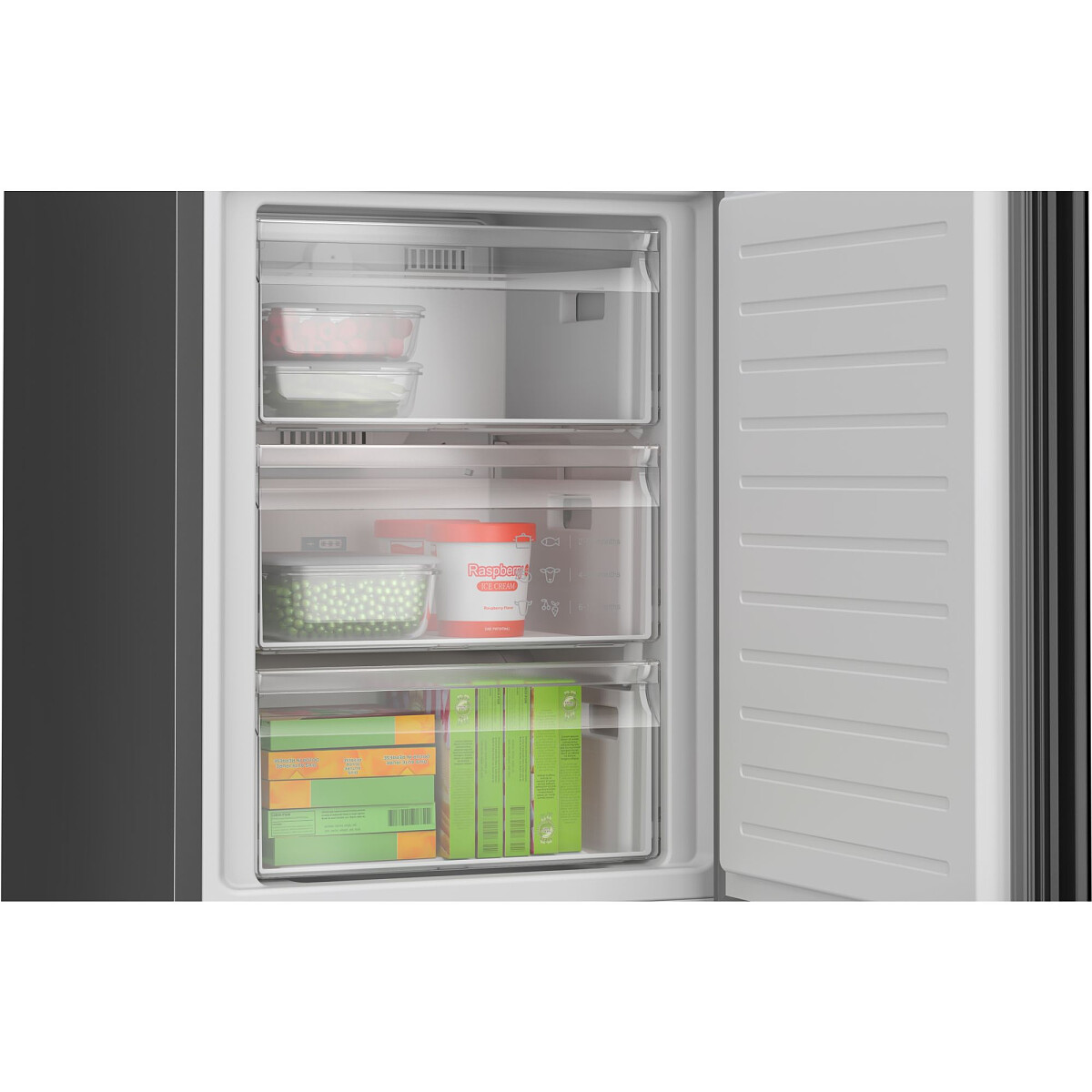 Możliwość regulacji półek sprawia, że możesz trzymać w chłodziarce produkty o różnych wielkościach. Wystarczy, że powiększysz dystans między półkami, a z powodzeniem schowasz garnek, który w standardowych warunkach by się nie zmieścił. Duża liczba szuflad w części chłodzącej pozwoli Ci na magazynowanie sporej ilości świeżych produktów, zapewniając odpowiednie warunki przechowywania. W urządzeniu znajdziesz wystarczającą liczbę balkoników do przechowywania napojów, butelek czy kartonów z mlekiem. Plusem tego produktu jest bezgłośna praca. Dźwięk, który wydaje, jest podobny do cichej rozmowy, co sprawia, że lodówka nie będzie Ci przeszkadzać w wykonywaniu codziennych obowiązków. W komorze chłodzenia zastosowano system No Frost, który zapewnia prawidłowy obieg powietrza i utrzymuje niską wilgoć. Sprawia to, że na ściankach komory chłodzenia nie osadza się szron ani lód, co całkowicie eliminuje konieczność ręcznego rozmrażania.