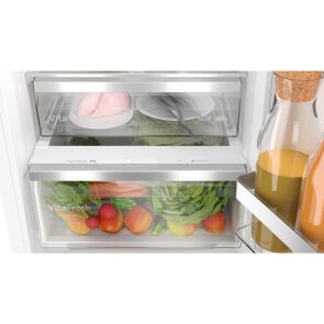 Lodówka Bosch Serie 6 KIN86ADB0 to doskonały wybór do zabudowy, łączący nowoczesne technologie z oszczędnością energii (klasa B). Dzięki funkcjom NoFrost i VitaFresh zapewnia długotrwałą świeżość produktów. Z pojemnością 260 litrów, trzema szufladami i oświetleniem LED gwarantuje komfort i wygodę użytkowania. Idealna dla osób ceniących funkcjonalność i elegancki design.