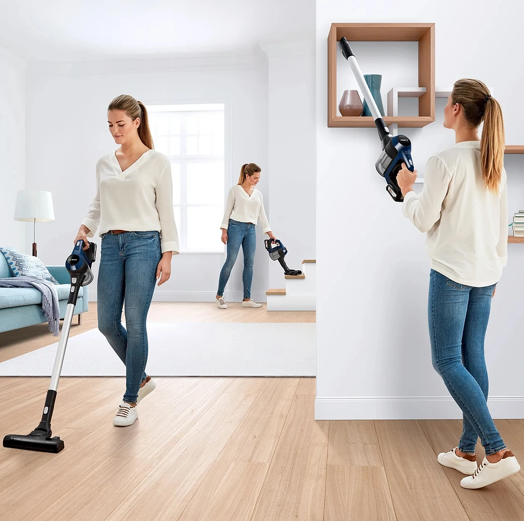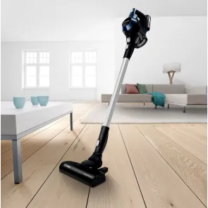 Odkurzacz pionowy nazywany także stojącym, umożliwi Ci błyskawiczne i wygodne odkurzenie całego domu. Taki odkurzacz jest lekki i poręczny, a dzięki pionowej konstrukcji jest łatwy w przechowywaniu. To odkurzacz 2w1, który zawiera w sobie cechy odkurzacza pionowego i ręcznego. Długa rura pozwoli Ci odkurzyć wszystkie podłogi i dywany w lokalu. Natomiast, gdy ją odczepisz, otrzymasz odkurzacz ręczny, z pomocą którego odkurzysz tapicerkę meblową i bez problemu dotrzesz do trudno dostępnych zakamarków. Do Twojej dyspozycji jest kilka poziomów mocy, dzięki czemu możesz dostosować siłę ssącą do stopnia zanieczyszczeń albo rodzaju odkurzanej nawierzchni. Normalny tryb pracy świetnie sprawdza się do codziennego odkurzania. Natomiast do usunięcia sierści kota lub psa konieczne mogą być większe obroty. Ten odkurzacz ma zasilanie akumulatorowe, dzięki czemu gwarantuje bezprzewodowe odkurzanie. Dzięki niemu bez problemu dotrzesz do miejsc, do których wcześniej dostęp blokował Ci przewód zasilający.