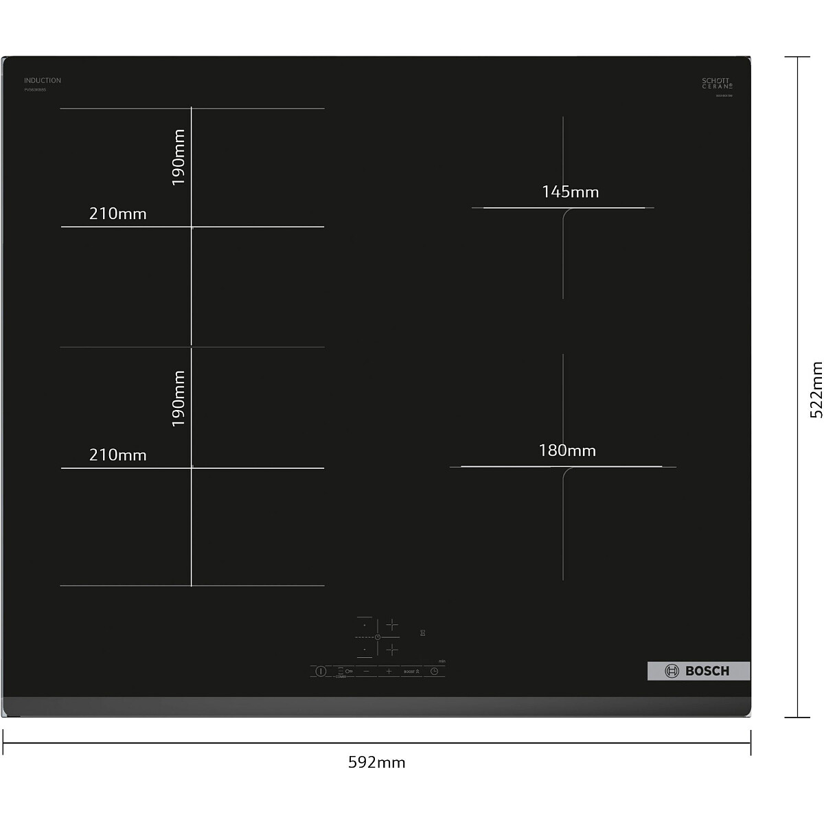 - Wielkość i moc strefy grzewczej: strona lewa, tylna: 190 mm, 210 mm, 2.2 kW (maks. moc 3.7 kW)