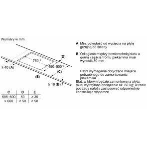- Wymagane wymiary montażowe wnęki (WxSxG mm) : 51 x 750 x (490 - 500)