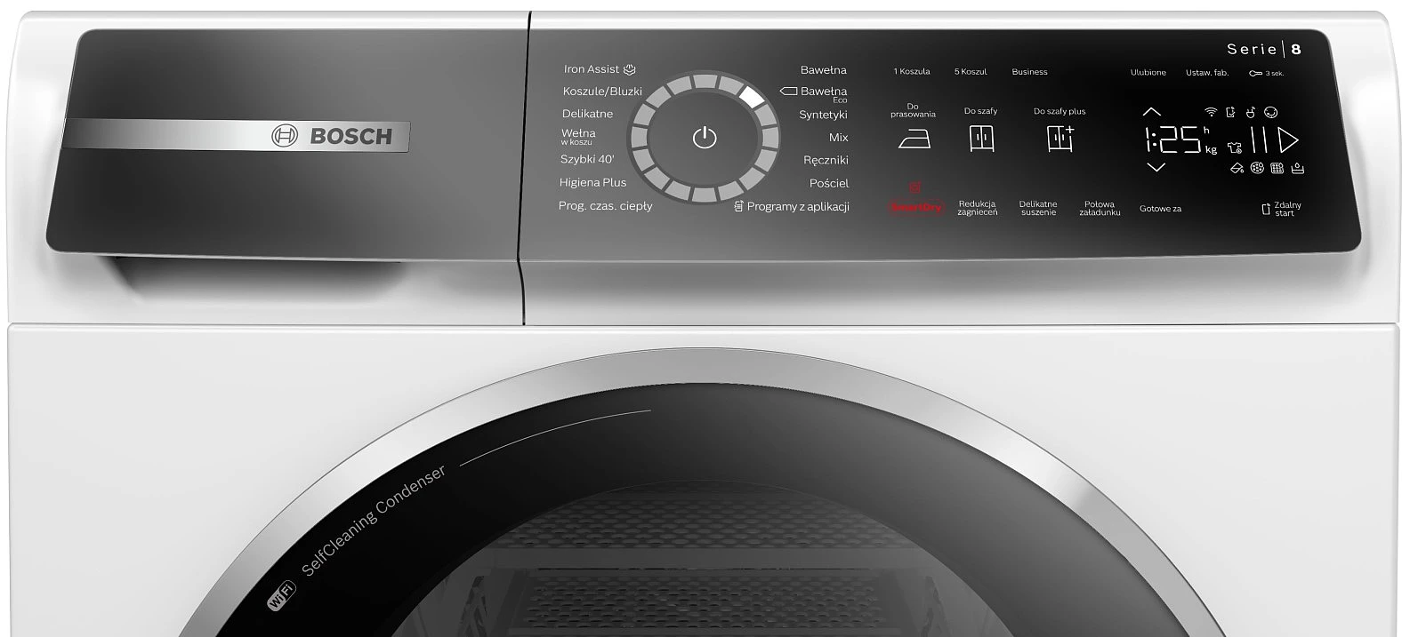 Programy suszeniaBawełna, Syntetyki, Delikatny, Pościel, Koszule / Bluzki, Bawełna Eco, Ręczniki, Higiena Plus, IronAssist, Mix, Wełna w koszu, Program czasowy ciepły, Super 40
