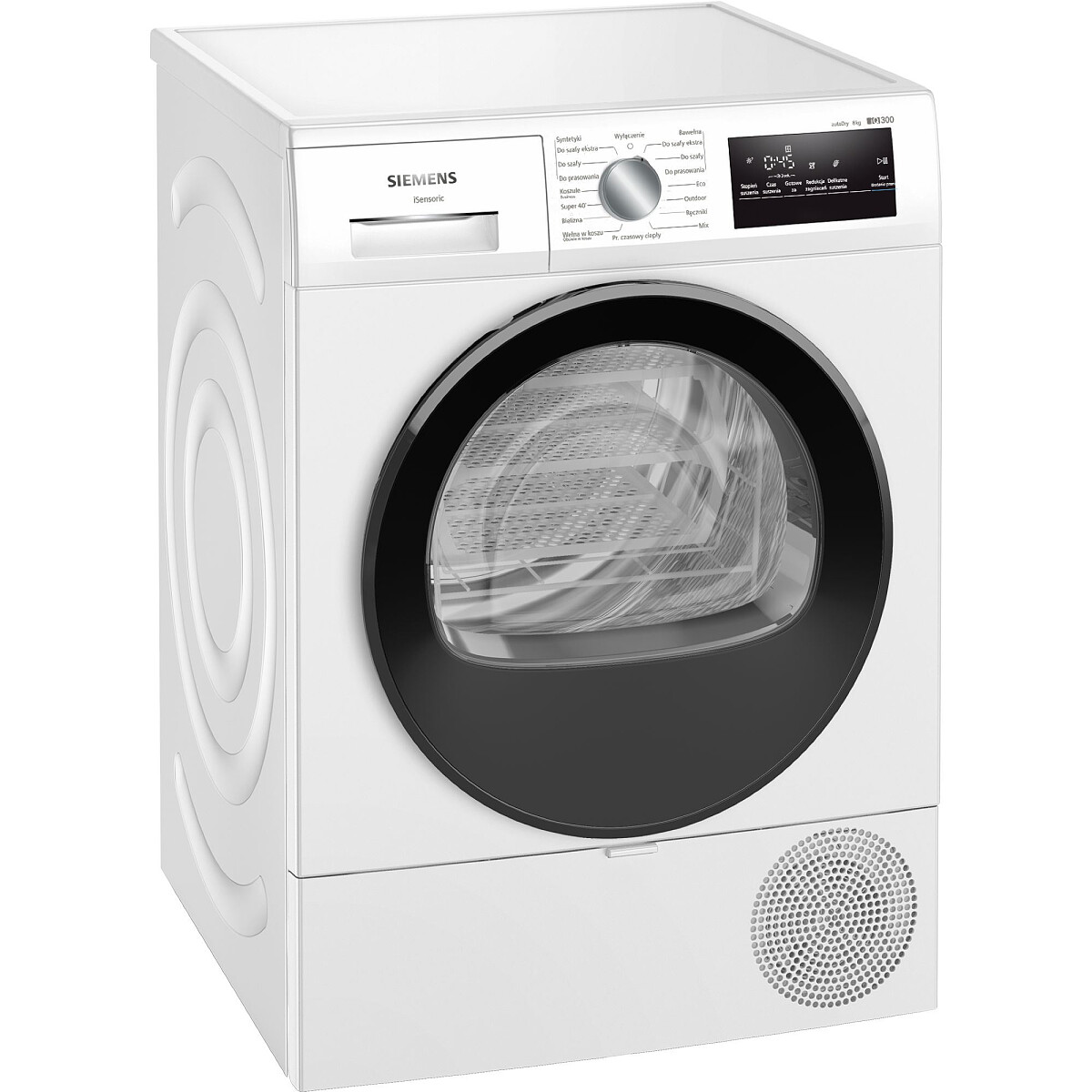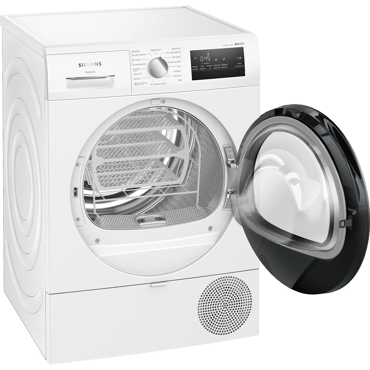 ZabezpieczeniaWskaźnik zapełnienia zbiornika kondensacyjnego, Wskaźnik informujący o konieczności wyczyszczenia filtra, Blokada rodzicielska, Sygnał akustyczny informujący o zakończeniu programu, Blokada drzwi, Wskaźnik czasu do końca programu