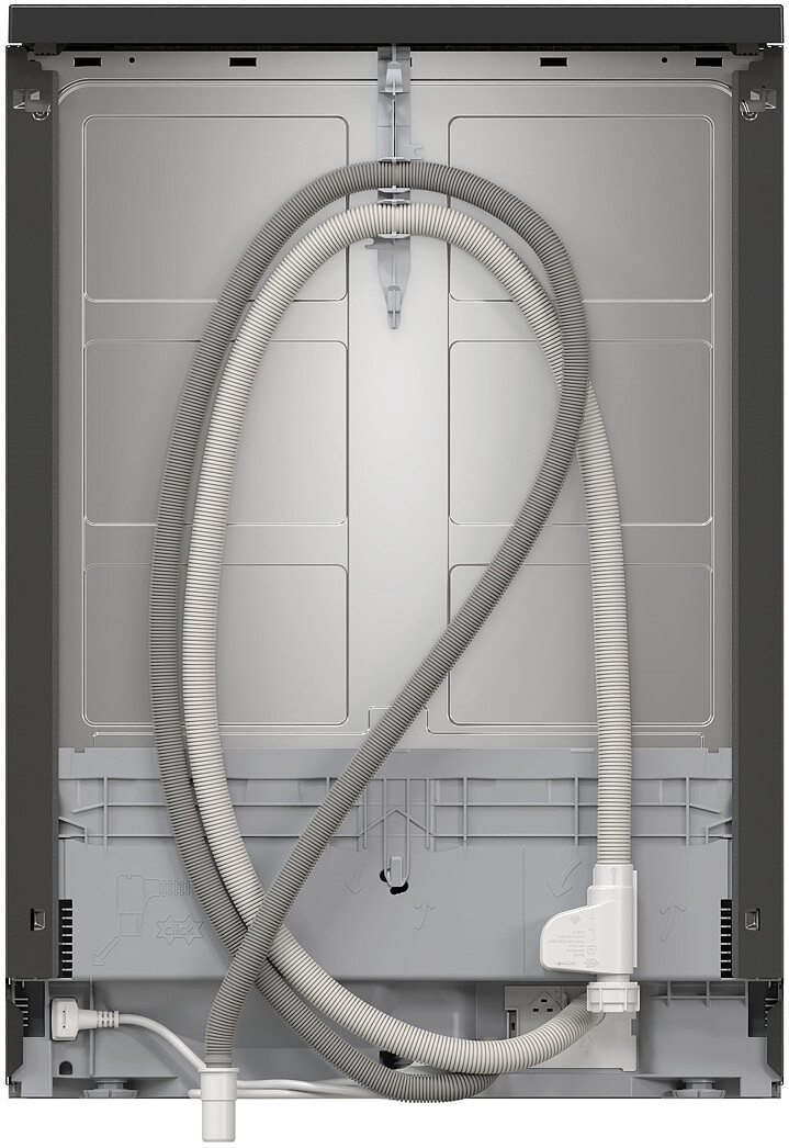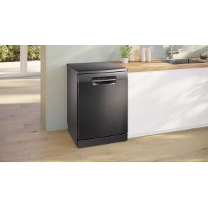 Zmywarka wolnostojąca w kolorze czarnej szczotkowanej stali z powłoką anti-fingerprint oraz regulowaną wysokością kosza zmywarki co usprawnia mycie wysokich naczyń.
