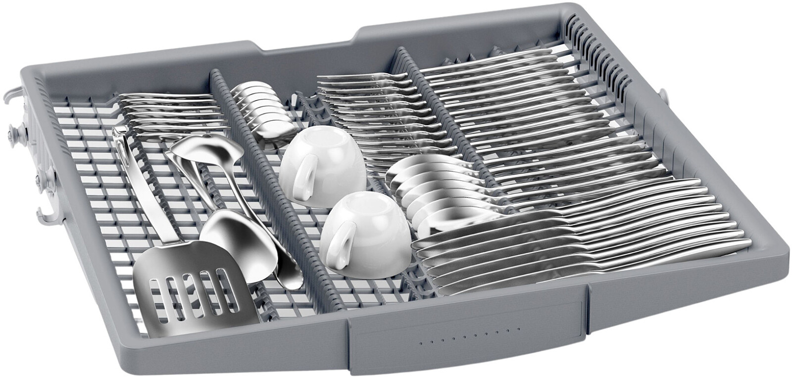 W ciągu pracy sprzęt plasuje się w standardowym przedziale głośności, dlatego nie będzie Ci przeszkadzać w realizowaniu codziennych czynności ani w odpoczynku. Producent zamontował w urządzeniu szufladę na sztućce zamiast zwykłego koszyka. Szuflada umieszczona jest nad górnym koszem, dzięki czemu w dolnym zyskujesz więcej miejsca na naczynia. Do szuflady możesz też wkładać długie przyrządy kuchenne, a nawet małe filiżanki. Funkcja opóźnienia startu pozwoli Ci ustawić czas rozpoczęcia mycia naczyń. Dzięki niej będziesz mógł nastawić zmywarkę tak, aby zakończyła program mycia tuż przed Twoim powrotem z pracy. Jedną z najbardziej przydatnych funkcji tego modelu jest połowa załadunku. Dzięki niej możesz nastawić program zmywania nawet wtedy, gdy zmywarka napełniona jest zabrudzonymi naczyniami zaledwie do połowy. Nie musisz się przy tym zamartwiać o większe zużycie wody i energii, gdyż urządzenie samoistnie dobierze ilość wody i prądu do ilości naczyń.