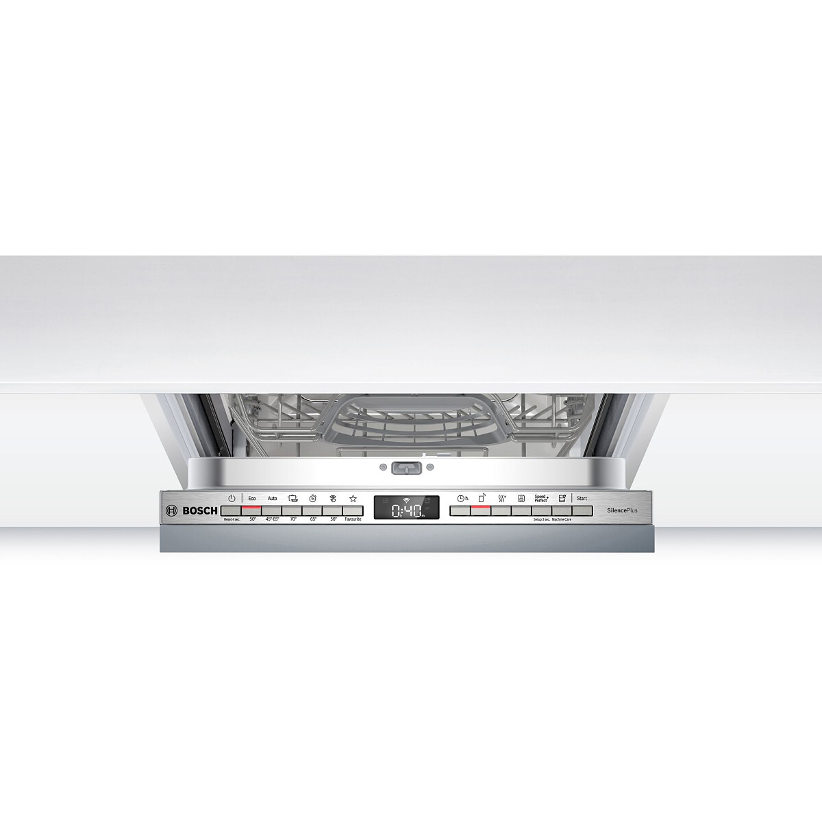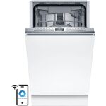 Serie 4. Zmywarka do zabudowy w pełni zintegrowana. Szerokość 45 cm. Szuflada Vario3.Extra Dry. Regulowana wysokość kosza-Rackmatic. Poziom głośności 44dB. Zdalny dostęp i kontrola za pomocą aplikacji Home Connect. Klasa energetyczna E.