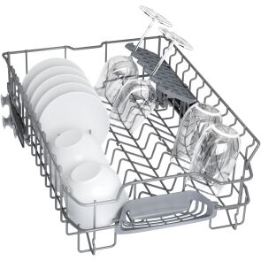 System regulacji położenia górnego kosza Rackmatic, służy dopasowaniu wnętrza do aktualnych potrzeb. System pozwala zmienić ustawienie kosza na różnych wysokościach, a wybraną pozycję można łatwo zmienić, nawet gdy kosz jest pełen. Dzięki temu możesz dostosować wnętrze do swoich potrzeb nawet dla bardzo wysokich talerzy w dolnym koszu, czy wysokich kieliszków czy kufli w górnym koszu.