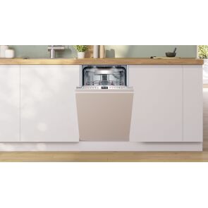 Ta zmywarka przeznaczona jest do zabudowy. Idealnie mieści się pod blatem, a jej front jest zabudowany frontem meblowym, co sprawia, że od zewnątrz przypomina standardową szafkę kuchenną. Szerokość tego modelu nie przekracza 45 cm. Oznacza to, że doskonale sprawdzi się w małych kuchniach, w których jest ograniczona ilość miejsca. W tym modelu producent ukrył panel sterowania. Jest on kompletnie niewidoczny z zewnątrz, dzięki czemu pozwala uzyskać harmonijną stylistykę kuchni. W dodatku tego typu panel można łatwo utrzymać w czystości, albowiem jest on mniej narażony na zabrudzenia.