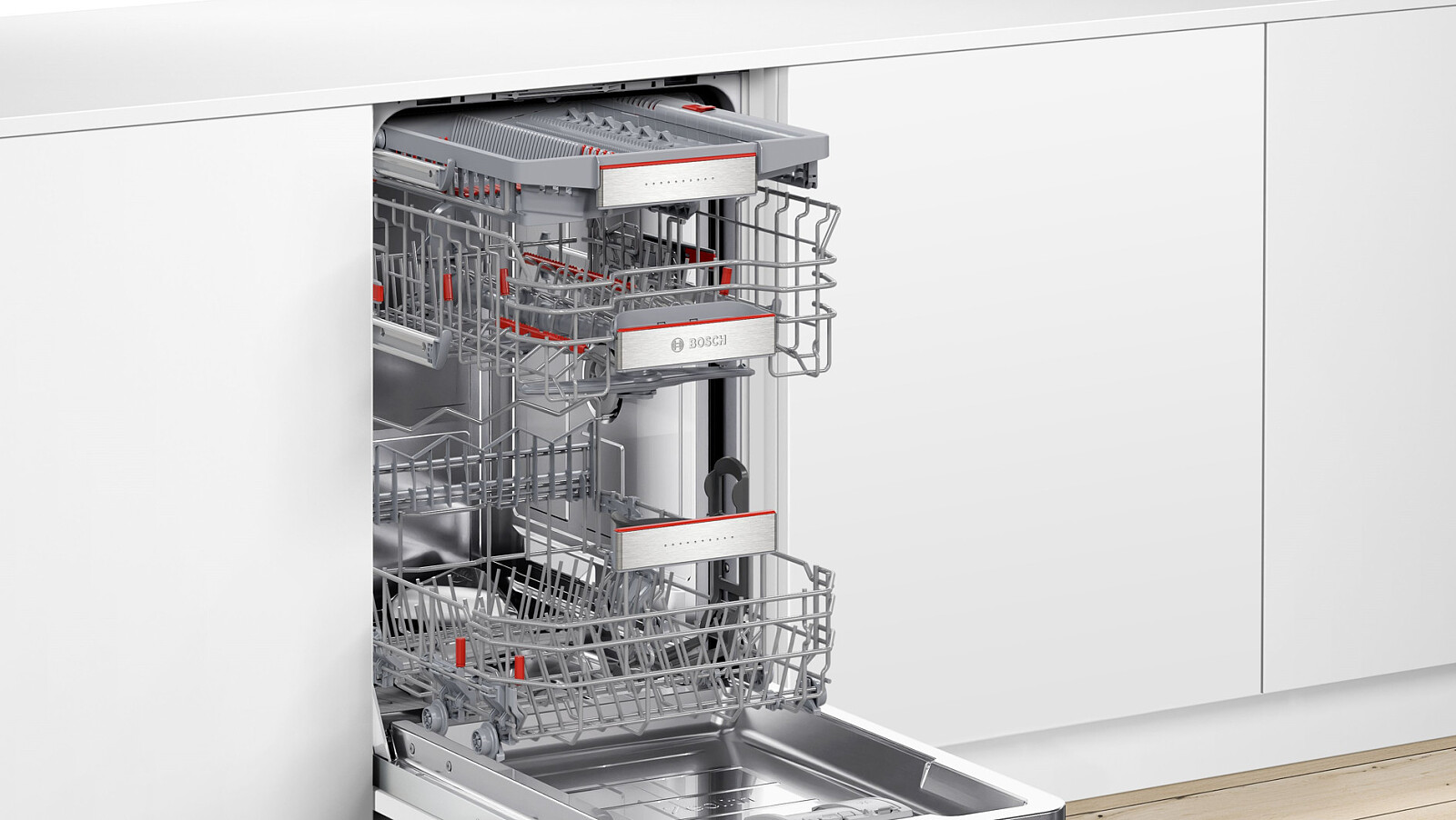 Dlaczego niektóre zmywarki są zaprojektowane tak, jakbyś gotował i jadł stałe menu? Nie nasze kosze VarioFlex Pro z szufladą Vario3 Pro. Ty cieszysz się zróżnicowaną dietą, one poradzą sobie z różnorodnymi naczyniami. Wystarczy skorzystać z ruchomych elementów oznaczonych na czerwono, aby zmienić konfigurację 10 składanych elementów na wszystkich trzech poziomach załadunku. Górny kosz o regulowanej wysokości oferuje ponadto składaną półkę na filiżanki i 2 elementy antypoślizgowe, a dolny - półkę na filiżanki i podpórkę na kieliszki. Szuflada Vario3 Pro może pomieścić nie tylko sztućce. Dzięki obniżanej części po prawej stronie szuflady uzyskuje się dodatkową przestrzeń do załadowania mniejszych filiżanek i miseczek, podczas gdy dłuższe przybory kuchenne, takie jak chochle, szpatułki i szczypce, znajdują bezpieczne miejsce w elastycznej lewej części szuflady. To wszystko daje więcej możliwości układania.
