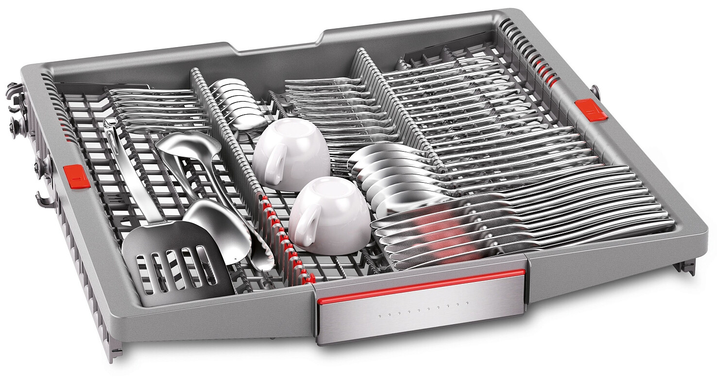 Najlepsze zmywarki mają w środku jeszcze więcej miejsca: szuflada Vario3 Pro zapewnia przestrzeń na duże akcesoria, takie jak np. łyżki wazowe. Ponadto boczną stronę szuflady można opuścić tym samym stwarzając przestrzeń na mniejsze naczynia - nawet filiżanki do espresso. Trzeci poziom eliminuje potrzebę montowania koszyka na sztućce , dzięki czemu masz więcej miejsca na talerze w dolnym koszu. Przyciski regulacji ruchomych elementów w szufladzie zostały oznaczone czerwonym kolorem, dzięki czemu wygodnie dostosujesz je do potrzeb.