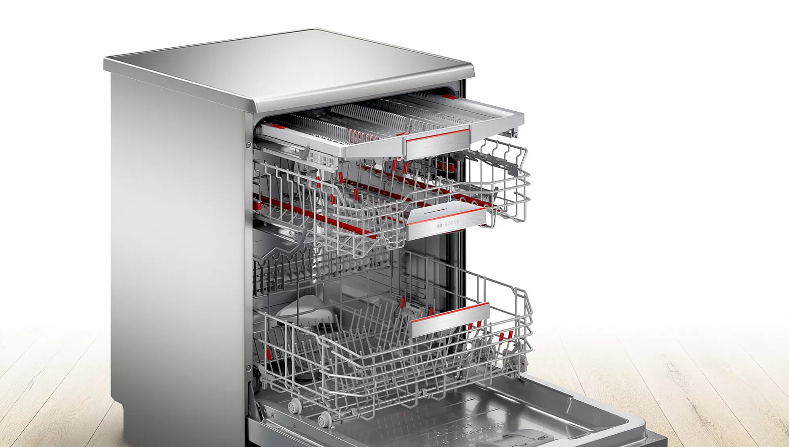 Ładowanie zmywarki stało się teraz o wiele łatwiejsze. Ruchome i naprzemiennie składane elementy ułatwiają bezpieczne ustabilizowanie większych naczyń w dolnym koszu. Górny kosz został wyposażony w miękkie, antypoślizgowe listwy służące bezpiecznemu ustabilizowaniu różnego rodzaju szklanek. Półki na filiżanki zyskały miękkie wykończenie chroniące delikatne kieliszki. Ulepszony system wysuwania zapewnia płynną obsługę nawet przy pełnym obciążeniu koszy.